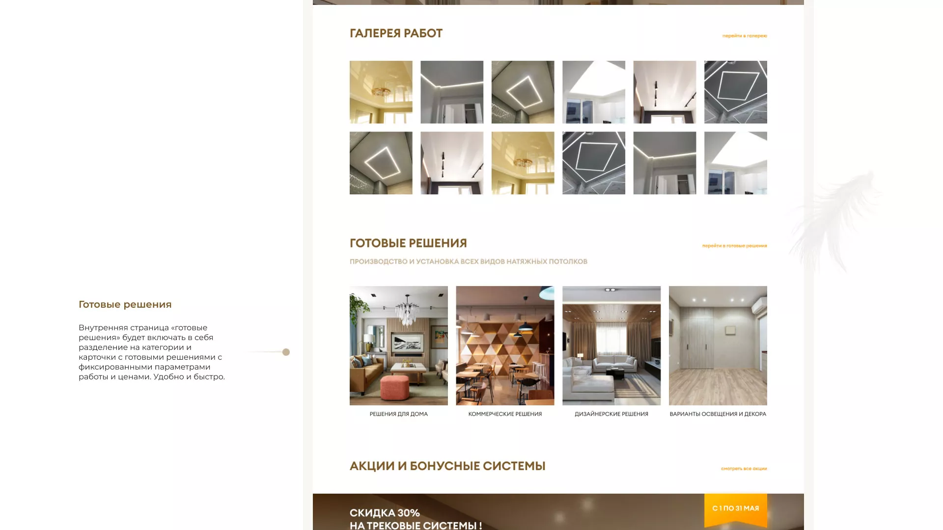 Что мы сделали. Разработали сайт в теплых и уютных «шоколадных» тонах. Продумали структуру, наполнили ее удобными разделами такими как «готовые решения», которые включают в себя не только уже готовые варианты с фиксированной ценой, но и разделение по категориям: решения для дома, коммерческих помещений, интересные дизайнерские решения. Так же предложили клиенту онлайн-калькулятор, что может существенно упростить потенциальным заказчикам нашего клиента в Кизеле заказ потолков.